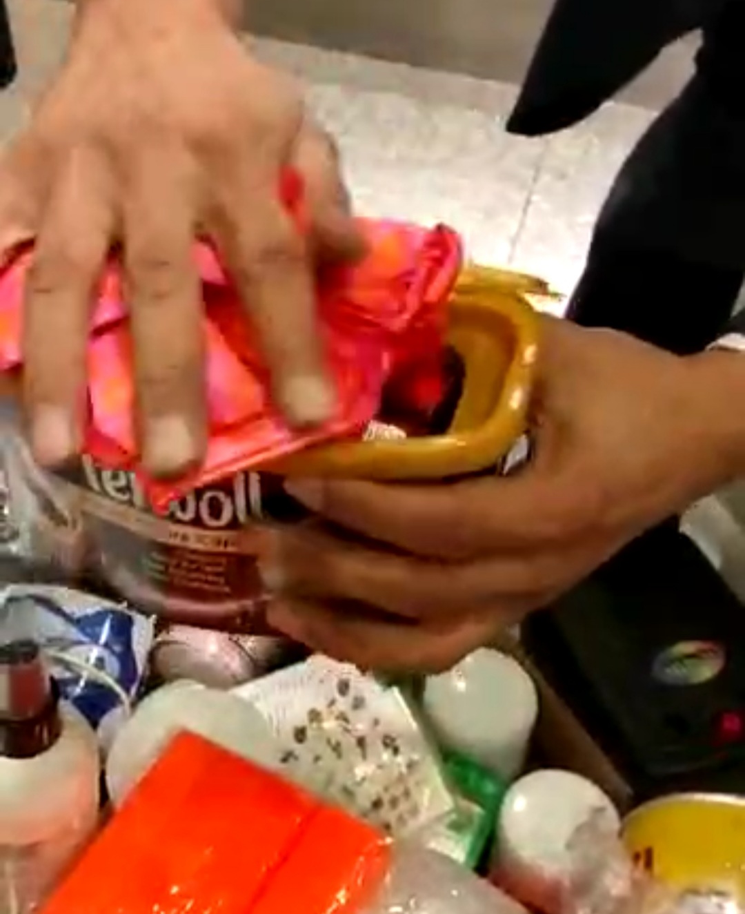 وبتفتيش حقائبها على جهاز الفحص بالأشعة بواسطة إبراهيم طه شاهين مأمور الجمرك والذي تلاحظ له وجود عبوات تكرارية متماثلة ومتنوعة داخل الحقائب.