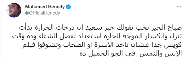 وكتب محمد هنيدي تغريدة على تويتر "صباح الخير نحب نقولك خبر سعيد ان درجات الحرارة بدأت تنزل وانكسار الموجة الحارة استعداد لفصل الشتاء وده وقت كويس جدا عشان تاخد الاسرة او الصحاب وتشوفوا فيلم الإنس والنمس في الجو الجميل ده"