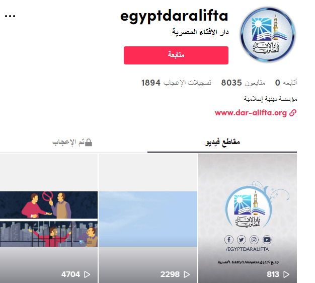 وقالت دار الإفتاء عبر صحفتها الرسمية على موقع التواصل الاجتماعي “فيس بوك”: "من أجل مزيد من الوعي، من أجل المزيد من التواصل الفعَّال، دار الإفتاء المصرية تنشئ حسابا لها على منصة جديدة، من أجل نشر الفتاوى الصحيحة بالفيديو، تابع حساب دار الإفتاء المصرية على تيك توك".
