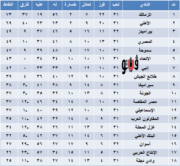 وجاء جدول ترتيب الدوري الممتاز كالتالي: