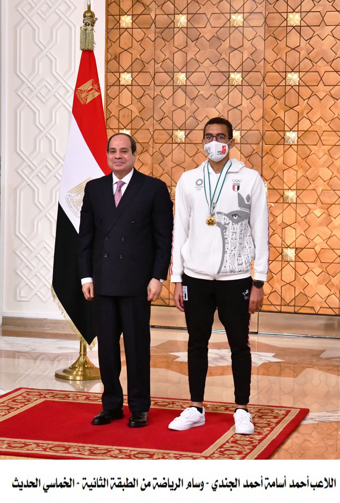 كما استقبل الرئيس السيسي اللاعبين واللاعبات والأطقم التدريبية المتوجة بميداليات خلال دورة الألعاب الأولمبية الأخيرة في طوكيو 2020، حيث قام الرئيس بمنح وسام الرياضة من الطبقة الأولى للاعبة الكاراتيه فريال عبد العزيز ومدربها هاني قشطة، ووسام الرياضة من الطبقة الثانية للاعب الخماسي الحديث أحمد الجندي ومدربه عبد الرحمن محمد، ووسام الرياضة من الطبقة الثالثة لكلٍ من لاعبة الكاراتيه جيانا فاروق ومدربها محمد عبد الرجال، ولاعب المصارعة محمد إبراهيم ومدربه محمد أحمد، ولاعبَي التايكوندو هداية ملاك وسيف عيسى ومدربَيهما أسامة سيد ومحمد مجدي والمدير الفني أوسكار سالازار.