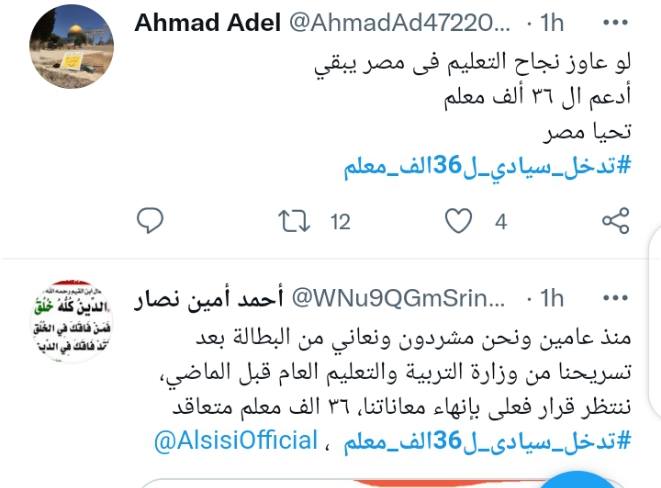 وقال أحد المعلمين في تدوينة له: “لو عاوز نجاح التعليم فى مصر يبقى أدعم الـ ٣٦ ألف معلم تحيا مصر”، وأضاف آخر: "منذ عامين ونحن مشردون ونعاني من البطالة بعد تسريحنا من وزارة التربية والتعليم العام قبل الماضي، ننتظر قرار فعلى بإنهاء معاناتنا، ٣٦ ألف معلم متعاقد".