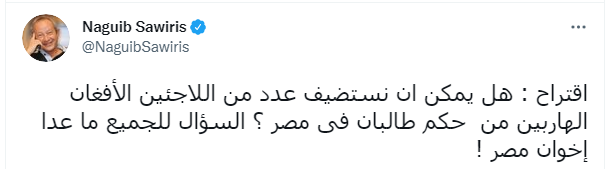 واقترح نجيب ساويرس تغريدة على تويتر قال فيها: "اقتراح: هل يمكن أن نستضيف عددا من اللاجئين الأفغان الهاربين من حكم طالبان فى مصر؟ السؤال للجميع ما عدا إخوان مصر!".