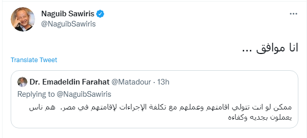 وهنا رد عماد الدين فرحات على الاقتراح قائلًا: "ممكن لو أنت تتولى إقامتهم وعملهم مع تكلفة الإجراءات لإقامتهم في مصر. هم ناس يعملون بجدية وكفاءة".
