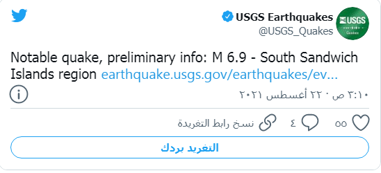 قالت هيئة المسح الجيولوجي الأمريكية، في ساعة مبكرة من صباح الأحد: إن زلزالًا قوته 6.9 درجة ضرب منطقة جزر ساندويتش الجنوبية.