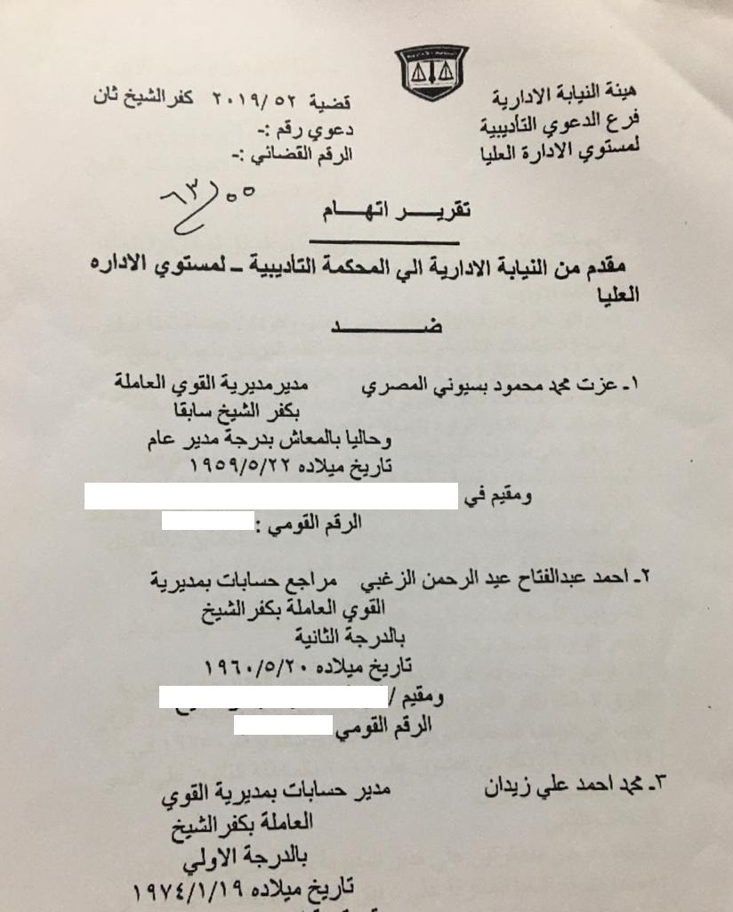 كشف تقرير قضائي صادر عن النيابة الإدارية النقاب عن قضية فساد مالي وإداري من العيار الثقيل داخل مديرية القوى العاملة بمحافظة كفر الشيخ أحيل على إثرها وكيل الوزارة ومدير ومراجع الحسابات ومسئولة الأضابير للمحاكمة العاجلة بعد ثبوت تلاعبهم في صرف بدلات الانتقال بالمخالفة لقرارات المحافظ، والاستيلاء على بدل الوجبات عن طريق تزوير مستندات الصرف.
