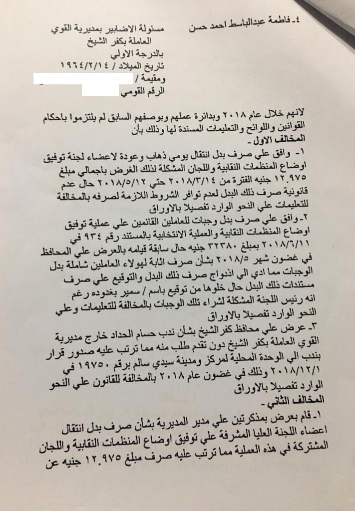 وكشفت تحقيقات النيابة الإدارية أن أحمد عبد الفتاح عيد، مراجع حسابات بالمديرية قام بعرض مذكرتين على مدير المديرية بشأن صرف بدل أنتقال أعضاء اللجنة العليا المشرفة على توفيق اوضاع المنظمات النقابية واللجان المشتركة فى هذه العملية مما ترتب عليه صرف مبالغ مالية رغم عدم قانونية الصرف لعدم توافر شروطه بالمخالفة للتعليمات.