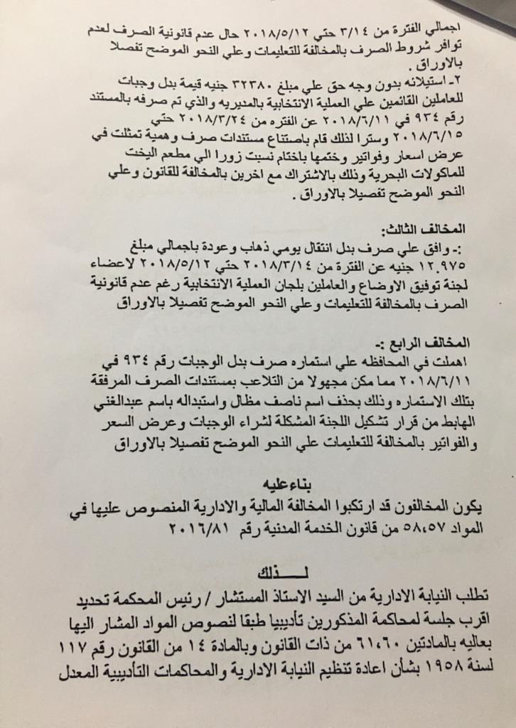 وافق المحال ايضًا على صرف بدل وجبات للعاملين القائمين على عملية توفيق أوضاع المنظمات النقابية والعلمية الانتخابية رغم سابقة قيامه بالعرض على المحافظ بشأن صرف اثابة لهؤلاء العاملين شاملة بدل الوجبات مما أدى الى اذدواج صرف ذلك البدل والتوقيع على صرف مستندات ذلك البدل حال خلوها من توقيع بأسم سمير بغدوده رغم أنه رئيس اللجنة المشكلة لشراء تلك الوجبات بالمخالفة للتعليمات.
