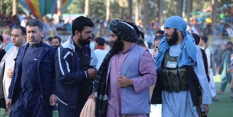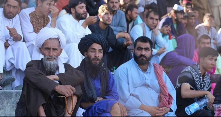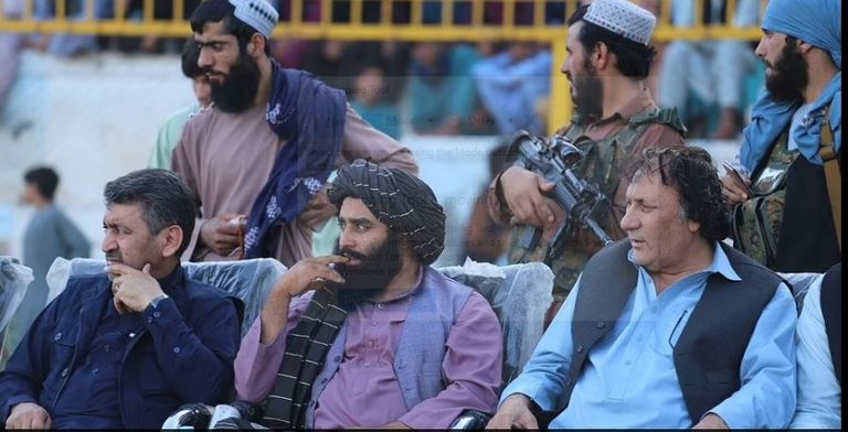 جلس مسلحو حركة طالبان على مدرجات أحد الملاعب، بروح رياضية لمتابعة مباراة لكرة القدم، في نهائي بطولة أطلقتها الحكومة الأفغانية السابقة.
