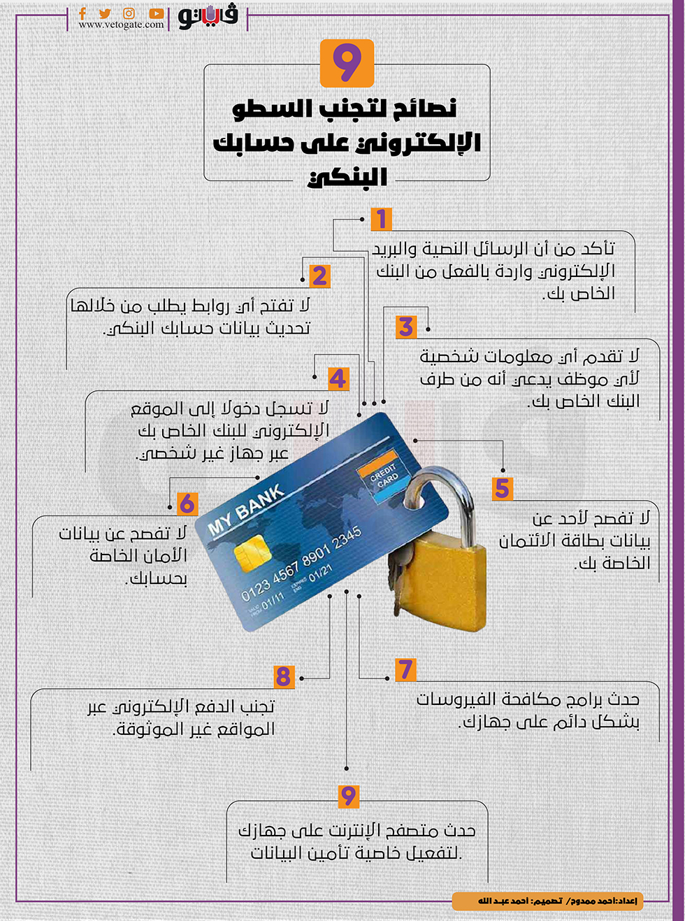 9 نصائح لتجنب السطو الإلكتروني على حسابك البنكي| إنفوجراف الأحد 22/أغسطس/2021 - 07:05 م 8/22/2021 7:05:33 PM أحمد ممدوح شارك طباعة 18 حجم الخط شارك طباعة التأمين ضد السطو السطو الالكتروني الحسابات البنكية تامين الحسابات البنكية