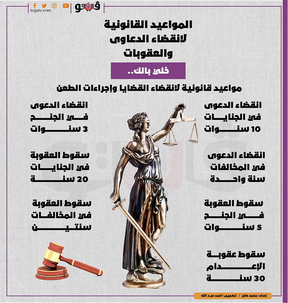 المواعيد القانونية لانقضاء الدعاوى والعقوبات| إنفوجراف الإثنين 23/أغسطس/2021 - 06:50 م 8/23/2021 6:50:20 PM خلي بالك.. مواعيد قانونية لانقضاء القضايا وإجراءات الطعن محمد صابر شارك طباعة 18 حجم الخط شارك طباعة محكمةالنقض الطعن مواعيد قانونية