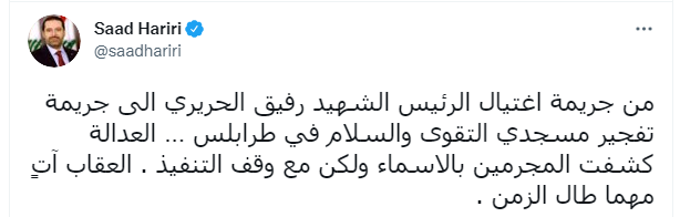 وكتب سعد الحريري تغريدة على تويتر "من جريمة اغتيال الرئيس الشهيد رفيق الحريري الى جريمة تفجير مسجدي التقوى والسلام في طرابلس… العدالة كشفت المجرمين بالاسماء ولكن مع وقف التنفيذ. العقاب آتٍ مهما طال الزمن"