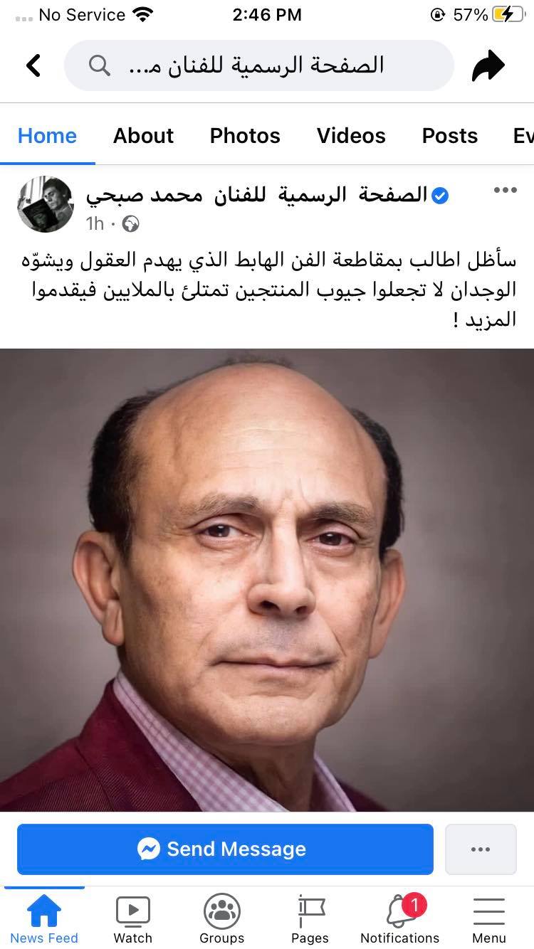 وكتب صبحي قائلا:" سأظل أطالب بمقاطعة الفن الهابط الذي يهدم العقول ويشوّه الوجدان لا تجعلوا جيوب المنتجين تمتلئ بالملايين فيقدموا المزيد ".