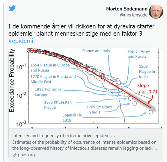 بالنسبة للوباء الأكثر فتكًا في التاريخ الحديث "الإنفلونزا الإسبانية"، التي قتلت أكثر من 30 مليون شخص بين عامي 1918 و1920، تراوحت احتمالية حدوث وباء بنفس الحجم من 0.3 إلى 1.9% سنويًا، أي يمكن لوباء بهذا الحجم أن يعيد نفسه خلال الأربعمائة عام القادمة، ومع ذلك من المرجح أن تتضاعف احتمالية تفشي أمراض جديدة مثل كورونا ثلاث مرات في العقود القليلة القادمة.