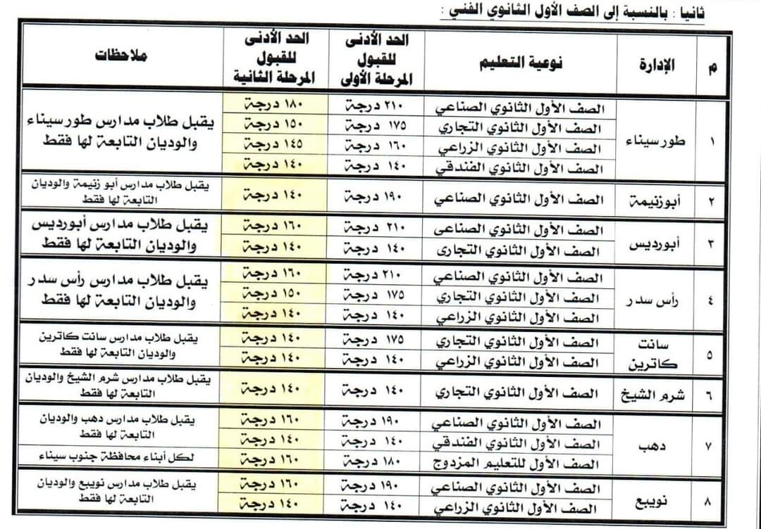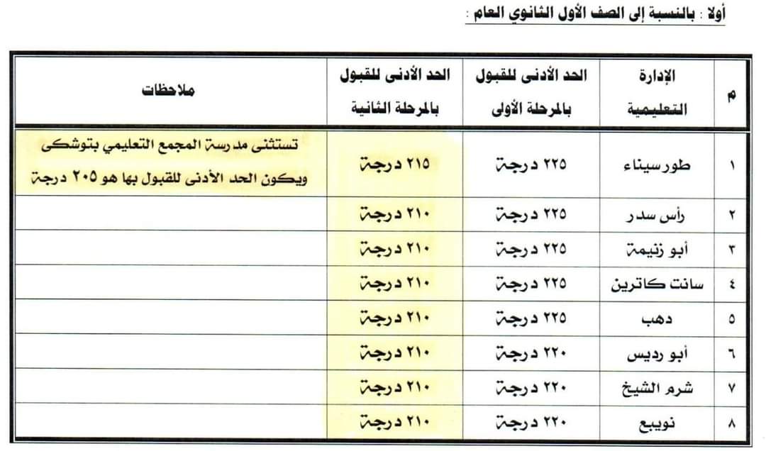 وأعلن المحافظ عن أن درجة القبول بالمرحلة الاولي بمدينة طور سيناء 225 درجة والمرحلة الثانية 215 درجة، ومدينة رأس سدر المرحلة الاولي 225 درجة والمرحلة الثانية 210 درجة، ومدينة ابو زنيمة المرحلة الاولي 225 درجة والمرحلة الثانية 210 درجة.