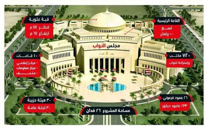 - تسع القاعة الرئيسية لمجلس النواب لاستيعاب 1000 عضو بمسطح 3 أضعاف المبنى الحالي للبرلمان بالقاهرة
