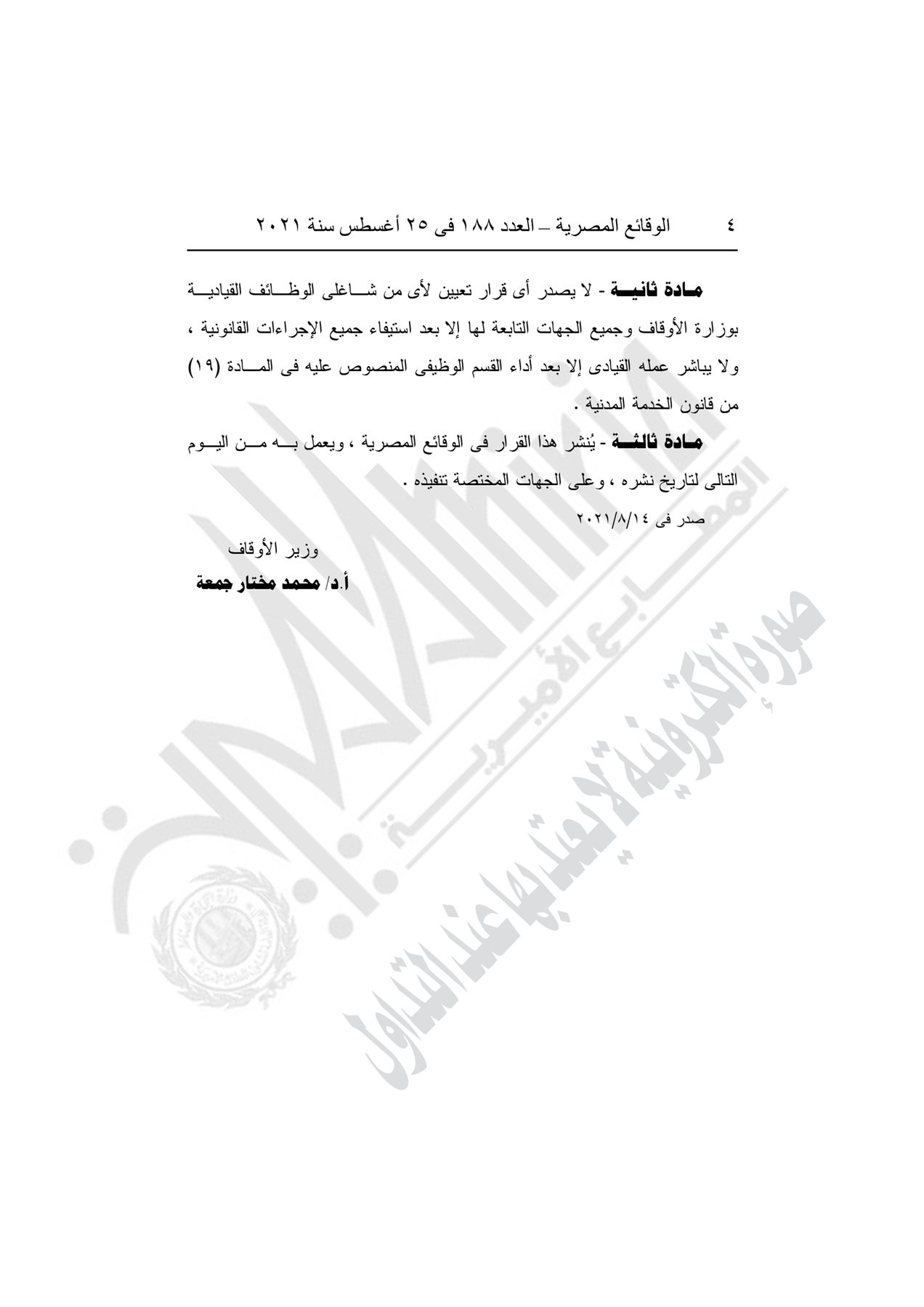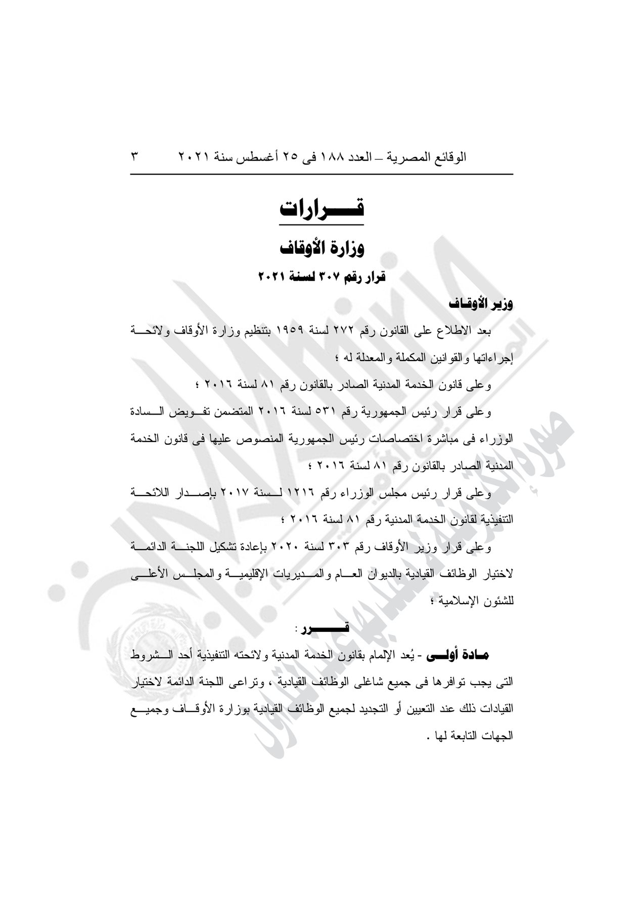 نشرت جريدة الوقائع المصرية في عددها رقم 188، الصادر في 25 أغسطس 2021، قرار وزارة الأوقاف رقم 307 لسنة 2021، بشأن اعتبار الإلمام بقانون الخدمة المدنية ولائحته التنفيذية أحد الشروط التي يجب توافرها في جميع شاغلي الوظائف القيادية.