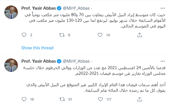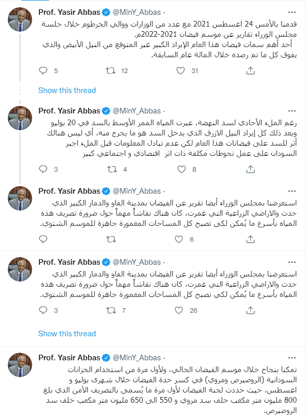 وكتب وزير الري السوداني ياسر عباس تغريدة على تويتر " قدمنا بالأمس 24 أغسطس 2021 مع عدد من الوزارات ووالي الخرطوم خلال جلسة مجلس الوزراء تقارير عن موسم فيضان 2021-2022م.