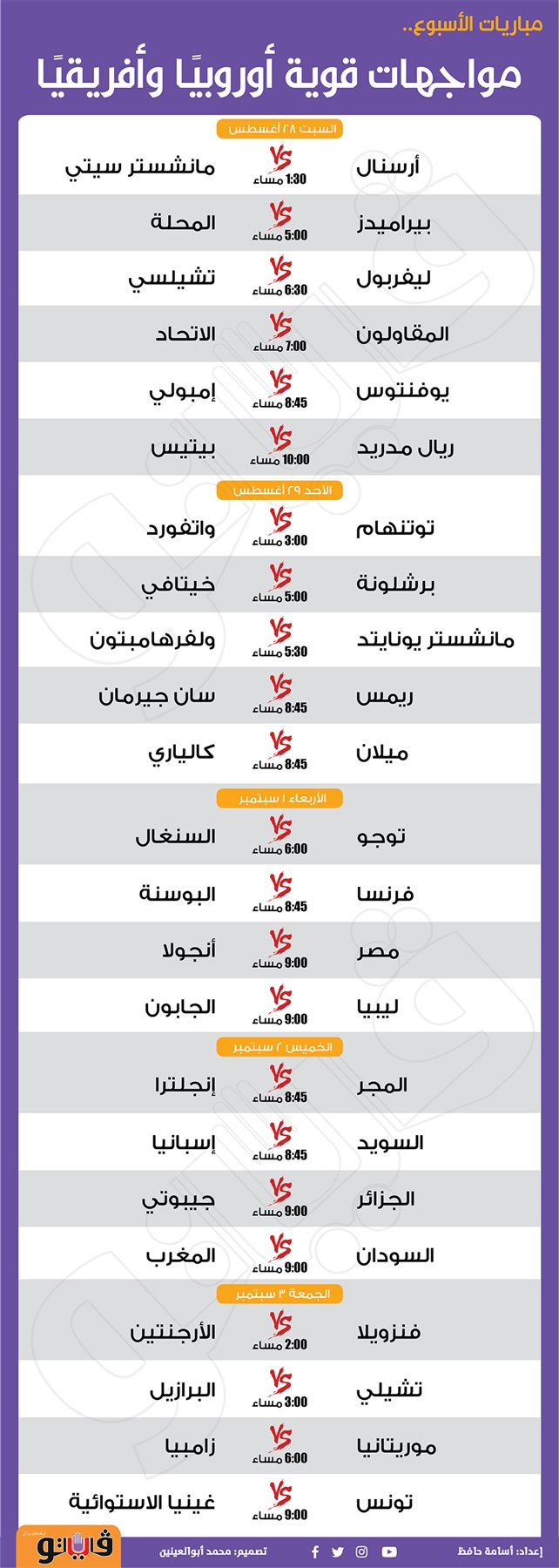 مباريات الأسبوع.. مواجهات قوية أوروبيًا وأفريقيًا | انفوجراف الجمعة 27/أغسطس/2021 - 07:03 م 8/27/2021 7:03:43 PM مباريات الأسبوع اسامة حافظ شارك طباعة 18 حجم الخط شارك طباعة مانشستر سيتي مانشستر يونايتد ليفربول مصر مباريات الاسبوع