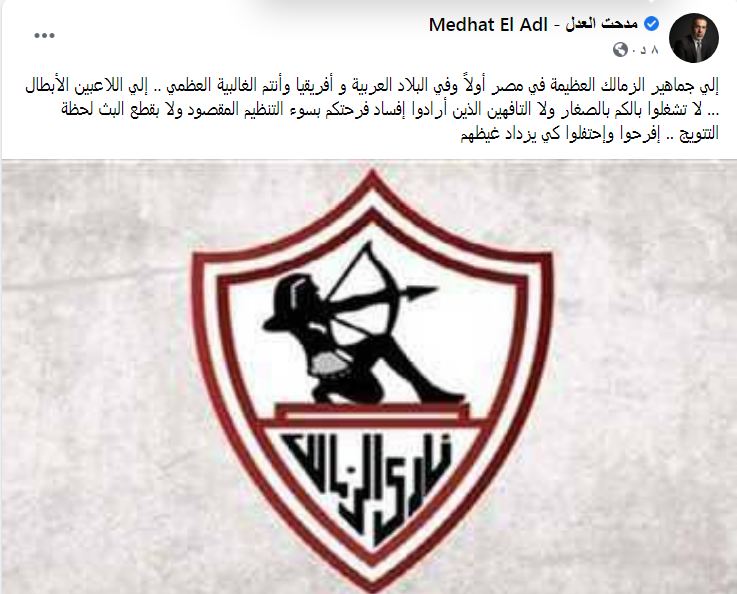 وجه مدحت العدل المؤلف والسيناريست المعروف بانتمائه للزمالك، رسالة لجماهير القلعة البيضاء بعد مشادة أحمد مجاهد رئيس اتحاد الكرة وشيكابالا صانع ألعاب الفريق.