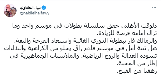 وتساءل الحلفاوي "هل ثمة أمل في موسم قادم راقٍ يخلو من الكراهية والبذاءات تسوده العدالة والروح الرياضية. والملاسنات الجماهيرية في إطار من المحبة. زهقنا من القبح".