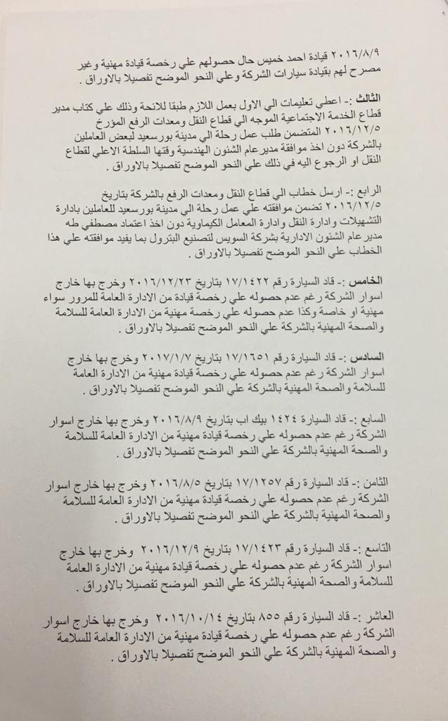 وجاء بمذكرة النيابة الإدارية أن أحمد علي غريب، موظف بالشركة وفوزي محمد أحمد، فني إطارات وأحمد خميس محمد، كهربائي بالإدارة الهندسية وأحمد عثمان حسن، فني تشغيل ماكينات بإدارة النقل وطارق عفيقي عجيمي، فني دوكو بالشركة وعبد الرازق خليفة محمد، مدير إدارة الصيانة، قادوا سيارات تابعة للشركة جهة عملهم وخرجوا بها خارج أسوار الشركة رغم عدم حصول أي منهم على رخصة قيادة مهنية من الإدارة العامة للسلامة والصحة المهنية