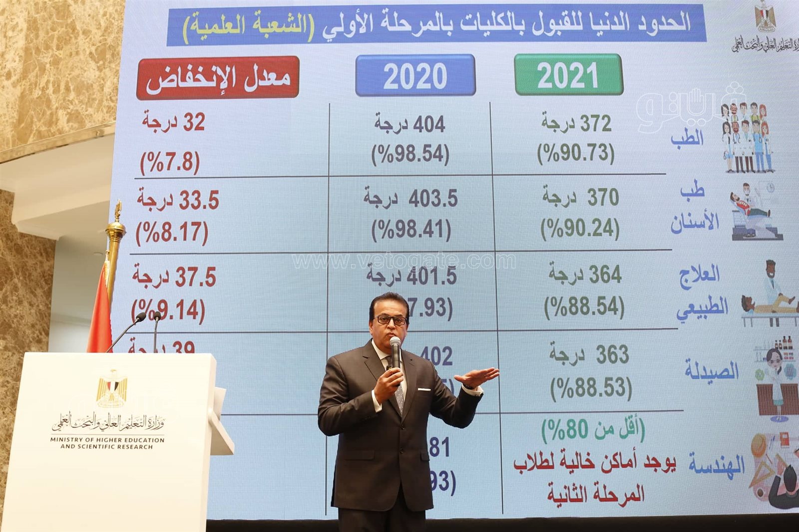 وكانت وزارة التعليم العالي قد حددت الحد الأدنى للقبول بالمرحلة الأولى لتنسيق 2021، بواقع 362.5 درجة فأكثر لشعبة علمي علوم بما يعادل 88.41%.