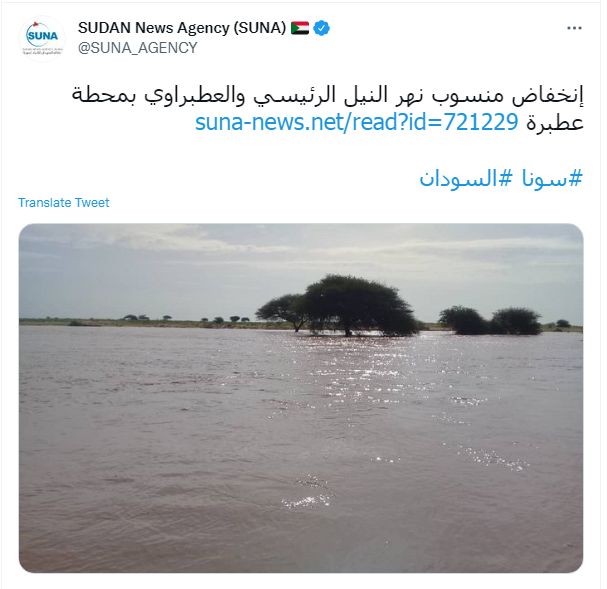 أكدت وكالة الأنباء السودانية "سونا"، أن نهرالنيل الرئيسي في السودان سجل اليوم 15 مترا و42 سم بانخفاض 3 سم عن منسوب، أمس السبت، وإنخفاض مترًا و2سنتيمتر عن منسوب العام الماضي، بينما سجل نهر عطبرة انخفاض 14 مترًا و55 سنتسمترَا بانخفاض 3سم عن منسوب، أمس السبت، وانخفاض مترًا و27 سنتيمترًا عن منسوب العام الماضي.