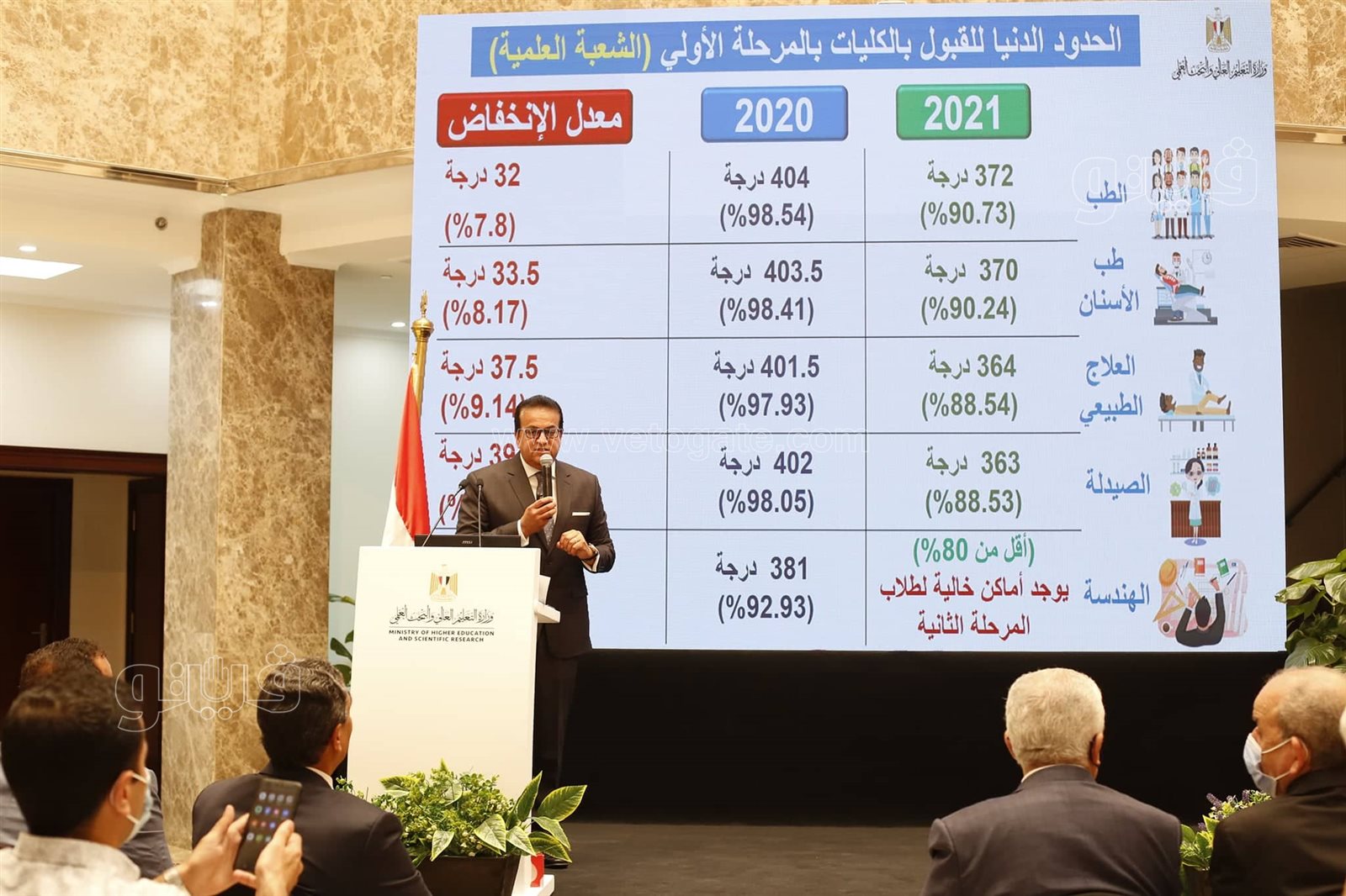 وكانت وزارة التعليم العالي قد حددت الحد الأدنى للقبول بالمرحلة الأولى لتنسيق 2021، بواقع 362.5 درجة فأكثر لشعبة علمي علوم بما يعادل 88.41%.