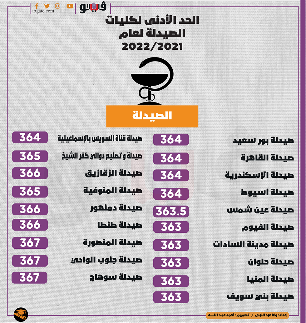 الحد الأدنى لكليات الصيدلة لعام 2021/2022 | انفوجراف الأحد 29/أغسطس/2021 - 02:00 م 8/29/2021 2:00:03 PM رضا عبدالنبى شارك طباعة 18 حجم الخط شارك طباعة تنسيق المرحلة الاولي الحد الادني كليات الصيدلة المرحلة الاولي