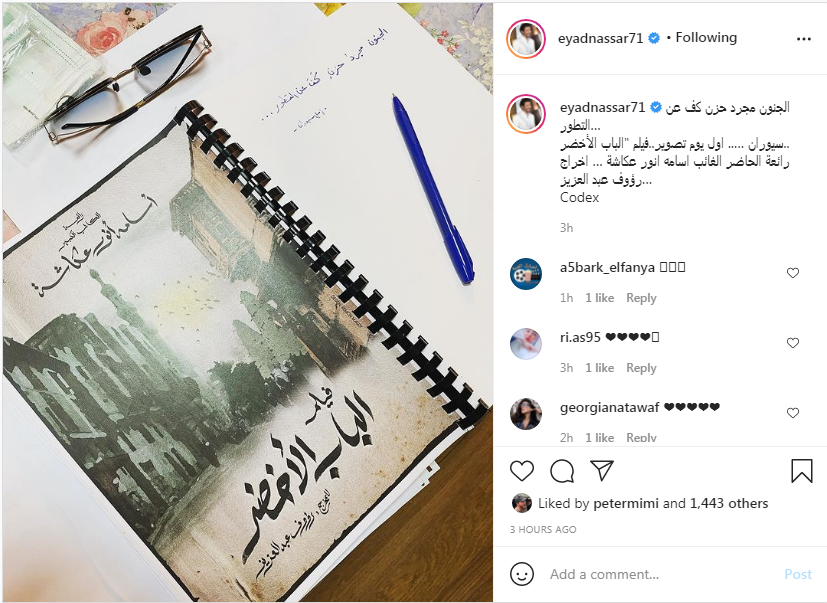 شوق النجم إياد نصار عبر حسابه الشخصي على موقع الصور الشهير "انستجرام"، جمهوره ومتابعيه بفيلم الباب الأخضر والذي يشارك فيه.