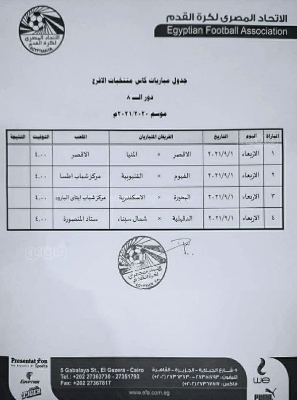 تنشر فيتو جدول مباريات دور الثمانية لمسابقة كأس الفروع لمنتخبات المناطق والتي ينظمها اتحاد الكرة بعدما أسدل الستار علي مباريات دور الـ 16 للمسابقة.