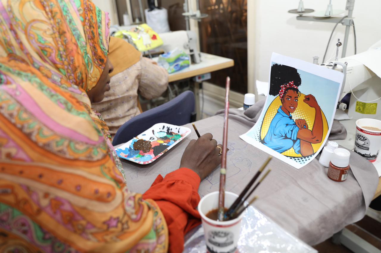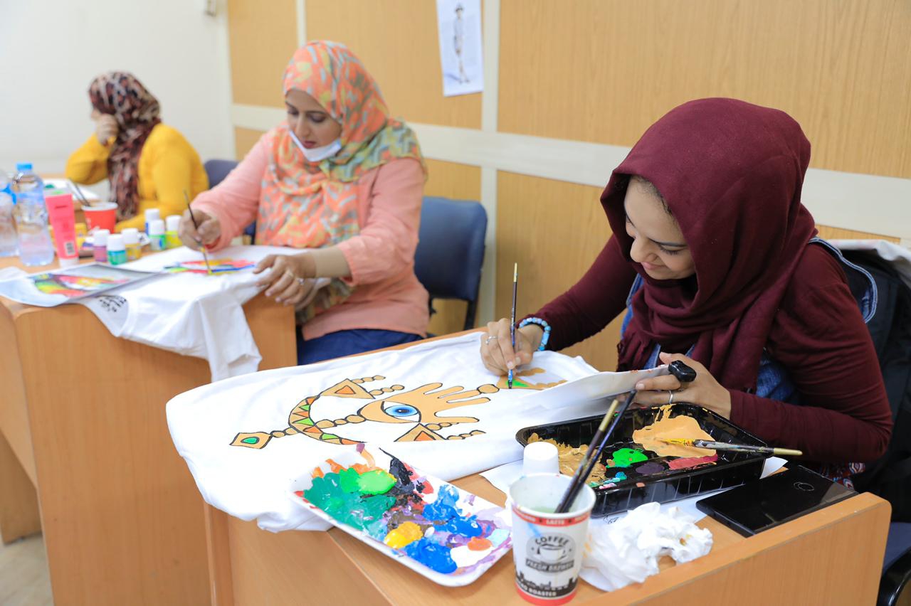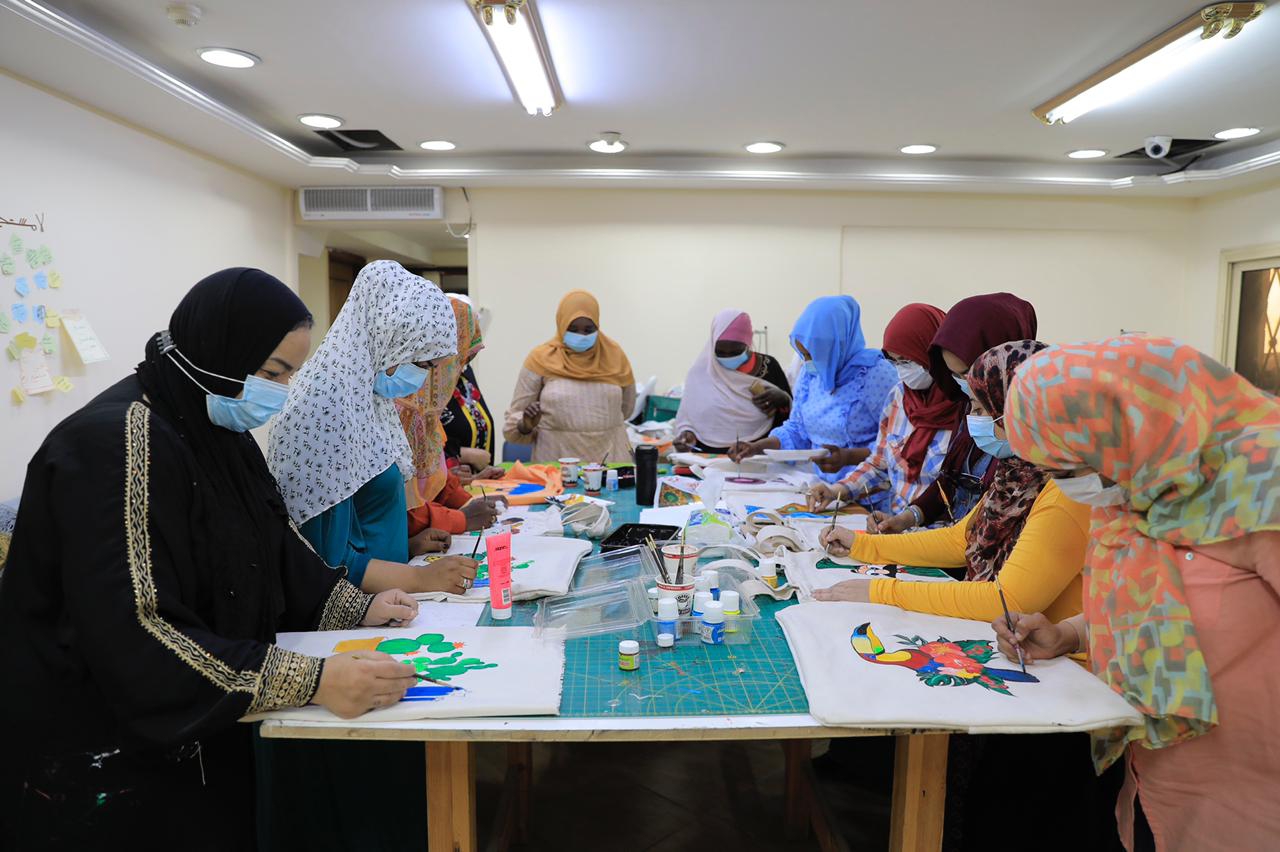 واستهدفت الورشة 13 سيدة من السيدات الوافدات والمصريات حيث تم تدريبهن بواسطة رائدة الأعمال المهندسة هانم يحيي إبراهيم، على حرفة الرسم على القماش (الديكوباج) وتضمن التدريب أساسيات الرسم على القماش من حيث طرق تكوين الألوان، وكيفية اختيارها وتنسيقها، وأسعار الخامات، وأماكن شرائها وكيفية البدء في مشروع بأقل التكاليف من المنزل.