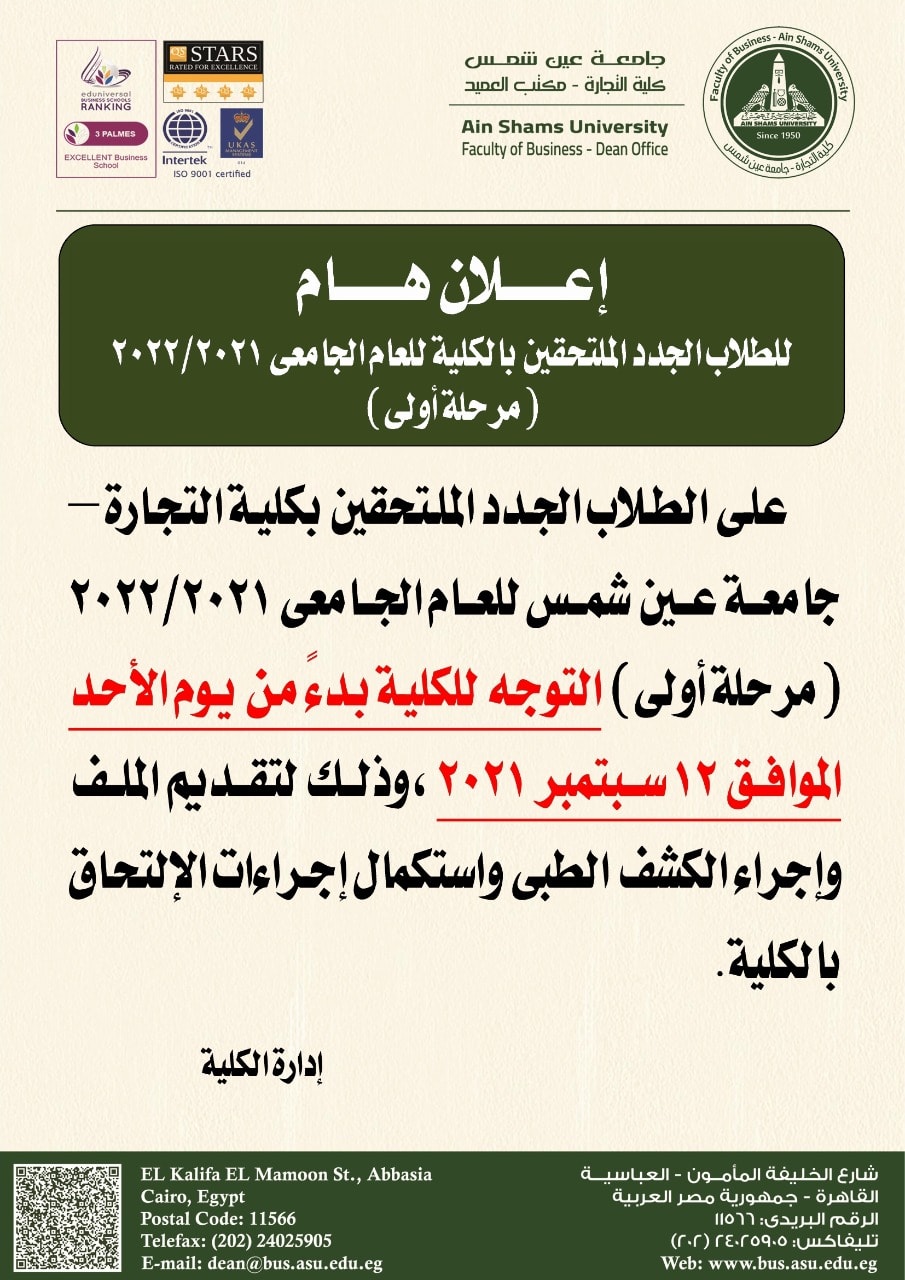 أعلنت كلية التجارة جامعة عين شمس عن بدء استقبال الطلاب الجدد الملتحقين بالكلية للعام الجامعى ٢٠٢١ /٢٠٢٢، من يوم الاحد الموافق ١٢ سبتمبر، لتقديم الملف وإجراء الكشف الطبى واستكمال إجراءات الالتحاق بالكلية.