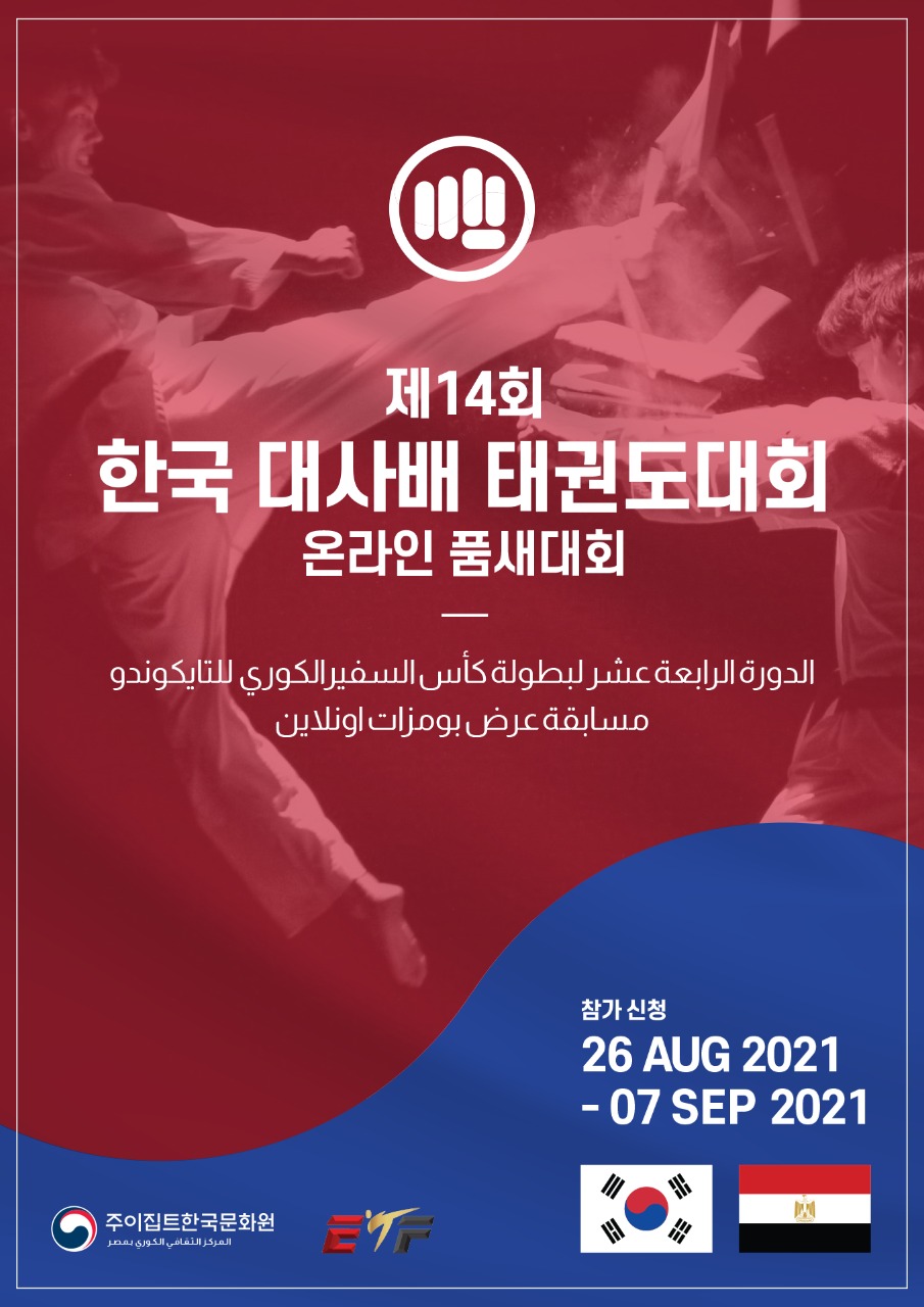 ينظم المركز الثقافي الكوري بالتعاون مع الاتحاد المصري للتايكوندو بطولة كأس السفير الكوري الرابعة عشرة للتايكوندو- عروض البومزات.