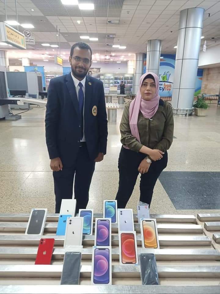 وبالعرض على عمرو شعبان مدير الحركة والمشرف على الصالة الخضراء قام بتكليف أحمد محمد رفاعى مأمور الجمرك بتفتيش حقائب الراكب وسيد فؤاد وأيمن على وأشرف عدلى لتفتيشه ذاتيا، فتبين وجود 15 هاتف محمول مخبأة داخل علب الشاي وبين طيات الملابس وأسفل علب شكولاتة داخل كيس خاص بالأسواق الحرة وداخل جيوب الراكب.