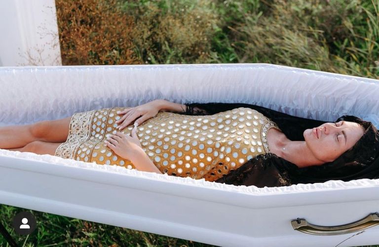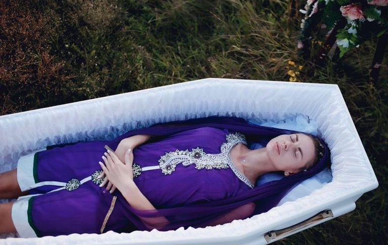 وتظهر الصور عارضات الأزياء بأعين مغلقة وأياد مطوية، مستلقيات داخل التوابيت، بملابس زاهية ووشاح يغطي الرأس.