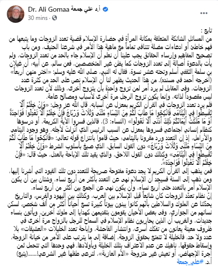 وكتب علي جمعة تدوينة على الفيس بوك "من المسائل الشائكة المتعلقة بمكانة المرأة في حضارة الإسلام قضية تعدد الزوجات وما يتبعها من فهم خاطئ أو ادعاءات مضلة تتنافى تمامًا مع ماهية هذا الأمر في شرعنا الحنيف".