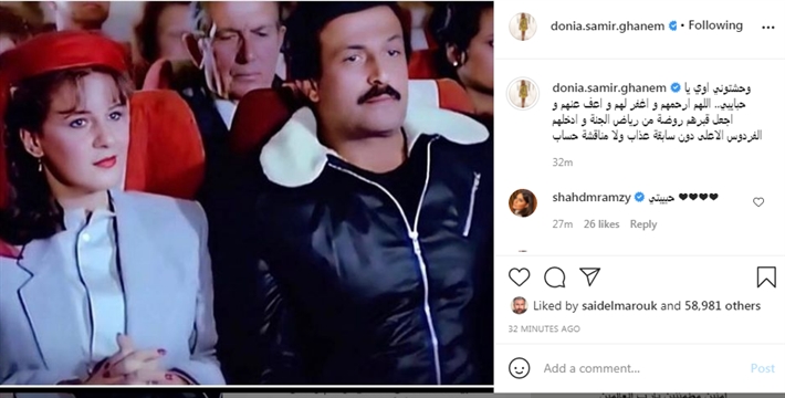 ونشرت دنيا سمير غانم عبر حسابها على “انستجرام” صورة لسمير غانم ودلال عبد العزيز من أحد الأفلام التي قاما ببطولتها سويا.