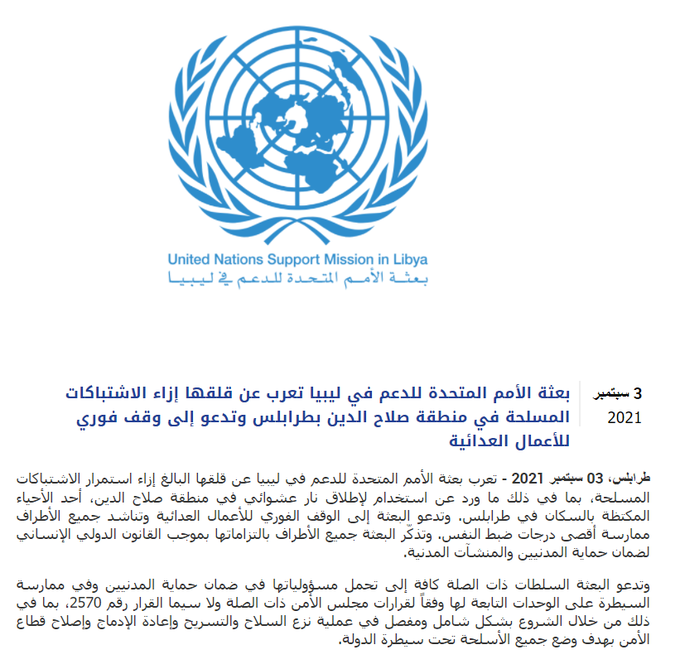 وأعربت البعثة، في بيان لها، عن قلقها البالغ إزاء استمرار الاشتباكات المسلحة، بما في ذلك ما ورد عن استخدام لإطلاق نار عشوائي في منطقة صلاح الدين، أحد الأحياء المكتظة بالسكان في طرابلس.