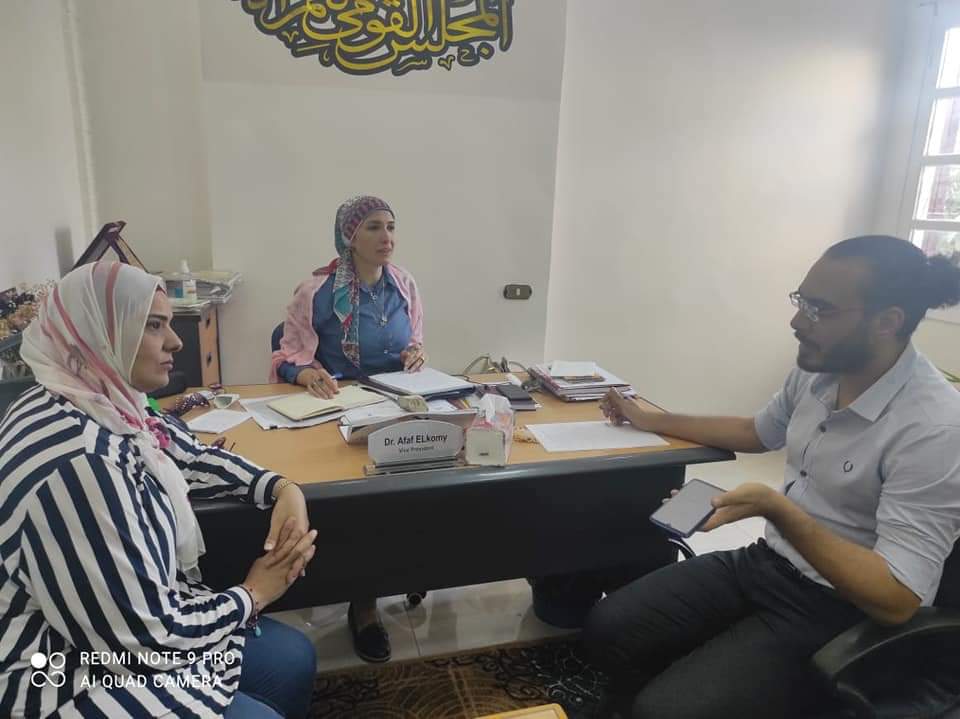 عقدت الدكتورة عفاف الكومي، مقررة المجلس القومي للمرأة في محافظة الإسماعيلية، اجتماعا، مع جيهان دياب المحامية وعضو المجلس والمشرفة على ملف مركز تأهيل المقبلين وحديثي الزواج ، والكاتب والأديب محمد زين المسئول عن مجموعة عمل الثقافة والآداب (المنسق ) للملف.
