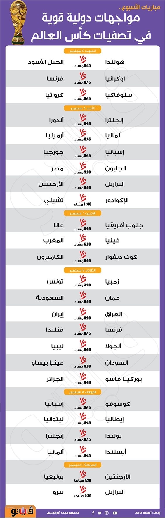 مباريات الأسبوع.. مواجهات دولية قوية في تصفيات كأس العالم| إنفوجراف الجمعة 03/سبتمبر/2021 - 05:30 م 9/3/2021 5:30:10 PM مصر اسامة حافظ شارك طباعة 18 حجم الخط شارك طباعة جنوب أفريقيا مصر ألمانيا اسبانيا تصفيات كأس العالم مباريات الاسبوع أوكرانيا