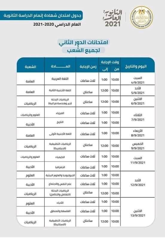 ويوم الأحد 5 سبتمبر اللغة الأجنبية الثانية، والإثنين 6 سبتمبر الجبر والهندسة الفراغية، والثلاثاء 7 سبتمبر الفيزياء والتاريخ، والأربعاء 8 سبتمبر اللغة الأجنبية الأولى، والخميس 9 سبتمبر الديناميكا، والسبت 11 سبتمبر الكيمياء والجغرافيا، والأحد 12 سبتمبر الجيولوجيا والعلوم البيئية وعلم النفس والاجتماع والتفاضل والتكامل، والإثنين 13 سبتمبر الأحياء والاستاتيكا والفلسفة والمنطق.لتكون نهاية امتحانات الدور الثاني.