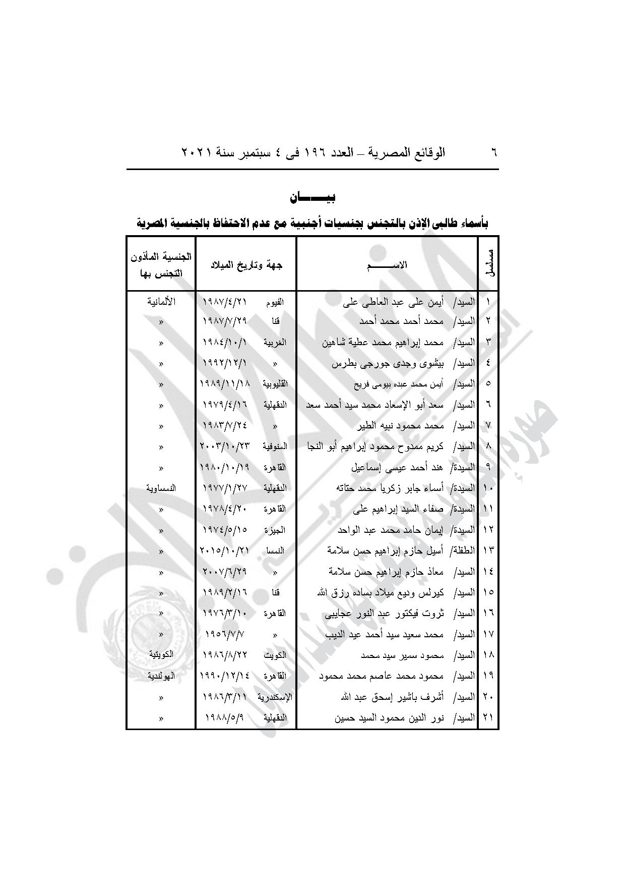 نشرت جريدة الوقائع المصرية في عددها رقم 196، الصادر في 4 سبتمبر 2021، قرار وزارة الداخلية رقم 1432 لسنة 2021، بشأن سحب الجنسية المصرية من 21 مواطنًا.