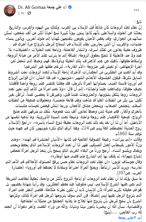وكتب علي جمعة تدوينة على الفيس بوك: "إنّ نظام تعدّد الزوجات كان شائعًا قبل الإسلام بين العرب، وكذلك بين اليهود والفرس، والتاريخ يحدّثنا عن الملوك والسلاطين بأنّهم كانوا يبنون بيوتًا كبيرة تسع أحيانًا أكثر من ألف شخص، لسكن نسائهم من الجواري، وفى بعض الأحيان يقومون بتقديمهن كهدايا إلى ملوك آخرين، ويأتون بنساء جديدات، والغريب أن الذين يحاربون نظام الإسلام في السماح للرجل بالزواج مرة أخرى في ظروف معينة يعانون من تفكك أسرى، وانتشار الفاحشة، وإباحة تعدد الخليلات «العشيقات» بلا عدد ولا حد، فالخليلة لا تتمتع بحقوق الزوجة، إضافة إلى ما يترتب على الأمر من خيانة الزوجة، وإسقاط حقوقها، ناهيك عن عدم الاعتراف بتلك الخليلة وبأولادها. فهي وحدها التي تتحمل ثمن أجرة الإجهاض، أو تعيش غير متزوجة «الأم العازبة»، لترعى طفلها غير الشرعي!"