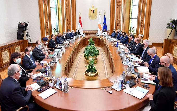 وقال السفير بسام راضي المتحدث الرسمي باسم رئاسة الجمهورية إن الرئيسين عقدا جلسة مباحثات ثنائية، تلاها اجتماع اللجنة الحكومية العليا، حيث رحب الرئيس بالرئيس القبرصي والوفد الوزاري المرافق له في بلدهم الثاني مصر، مؤكدًا أهمية العمل على استثمار ما يتوفر لدى البلدين الصديقين من إمكانات كبيرة لتحقيق مصالحهما المشتركة بما يمثل نموذجًا يحتذى به على المستوى الإقليمي في الترابط والتعاون.