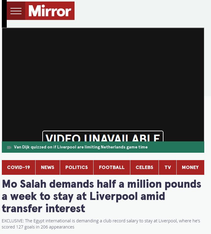 وأكدت صحيفة ميرور أن محمد صلاح يطلب 500 ألف جنيه إسترليني أسبوعيًا لتجديد عقده مع ناديه ليفربول الإنجليزي، حيث يتقاضى حاليًا 200 ألف إسترليني أسبوعيًا.