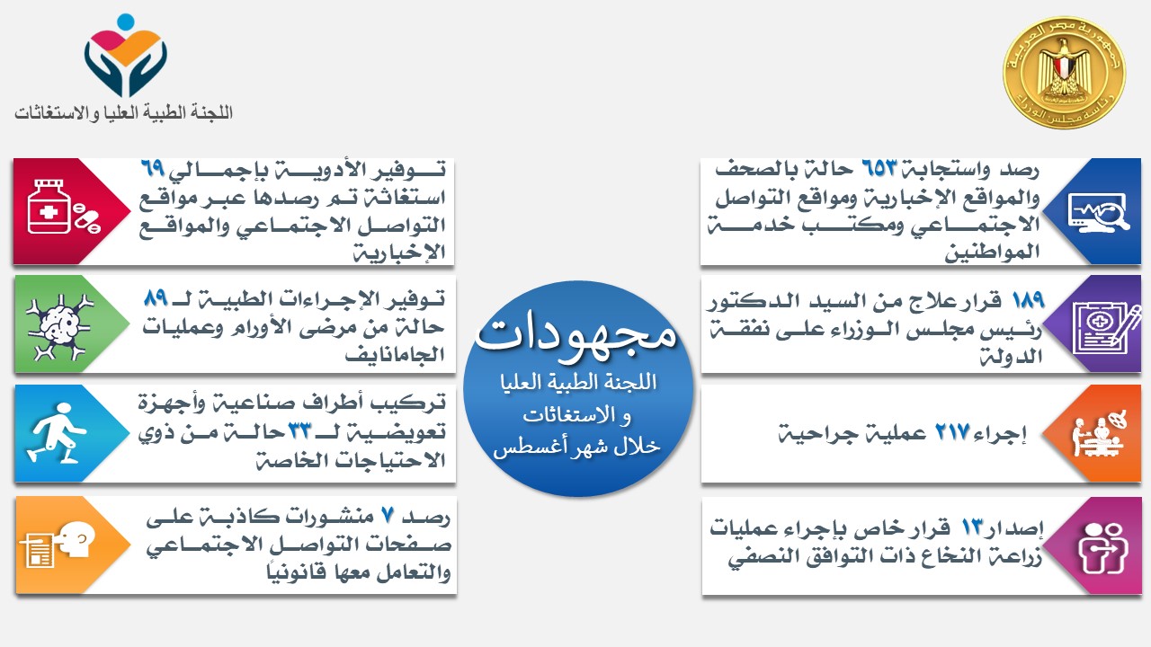 وأوضح المستشار الطبي لرئاسة مجلس الوزراء، أن الاستجابات خلال شهر أغسطس شملت صدور 189 قرار علاج من رئيس الوزراء على نفقة الدولة، للفئات الأكثر احتياجًا، فضلًا عن إجراء 217 عملية جراحية، وإصدار 13 قرارًا خاصا بإجراء عمليات زراعة النخاع ذات التوافق النصفي.