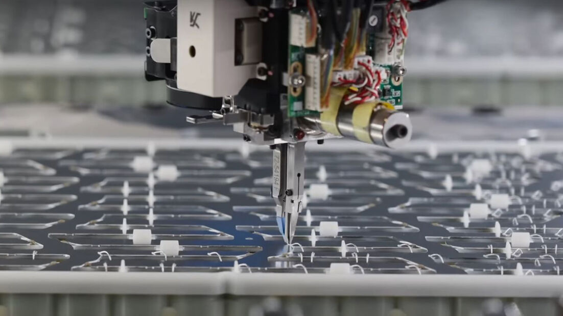 تمتلئ العلب الضخمة بخلايا بطارية أسطوانية تقف منتصبة على التوالي. يقوم الروبوت بإغلاق الهيكل بلوحة معدنية متصلة من الأعلى. في الوقت نفسه، تكون مجموعة المحرك في حالة تأرجح كامل: يأخذ الروبوت الفراغات الدوارة من أرفف المورِّد المعدة، وبعد لحظات يتم لف الأسلاك النحاسية في الدوار تمامًا. تعمل المحركات المُجمَّعة على مسافات متقاربة على حزام إلى خطوة الإنتاج التالية.