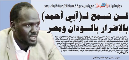 توعد زعيم جبهة تحرير قامبيلا الإثيوبية، قلواك بوم بال، بإسقاط نظام رئيس الوزراء آبى أحمد، ووجه رسالة للسودان ومصر تتعلق بسد النهضة.